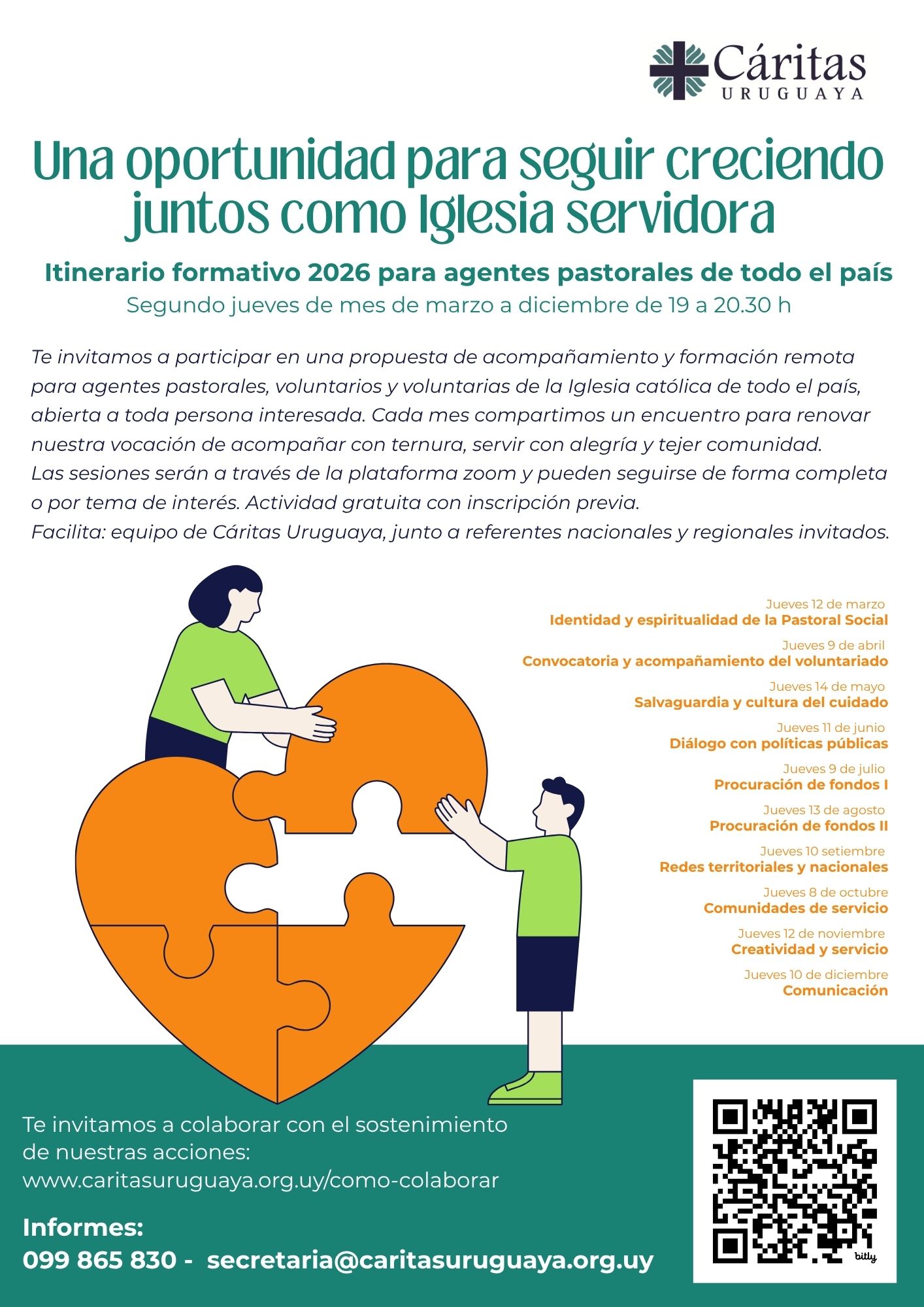 Te invitamos a participar en una propuesta de acompañamiento y formación remota para agentes pastorales, voluntarios y voluntarias de la Iglesia católica de todo el país, abierta a toda persona interesada. Cada mes compartimos un encuentro para renovar nuestra vocación de acompañar con ternura, servir con alegría y tejer comunidad.