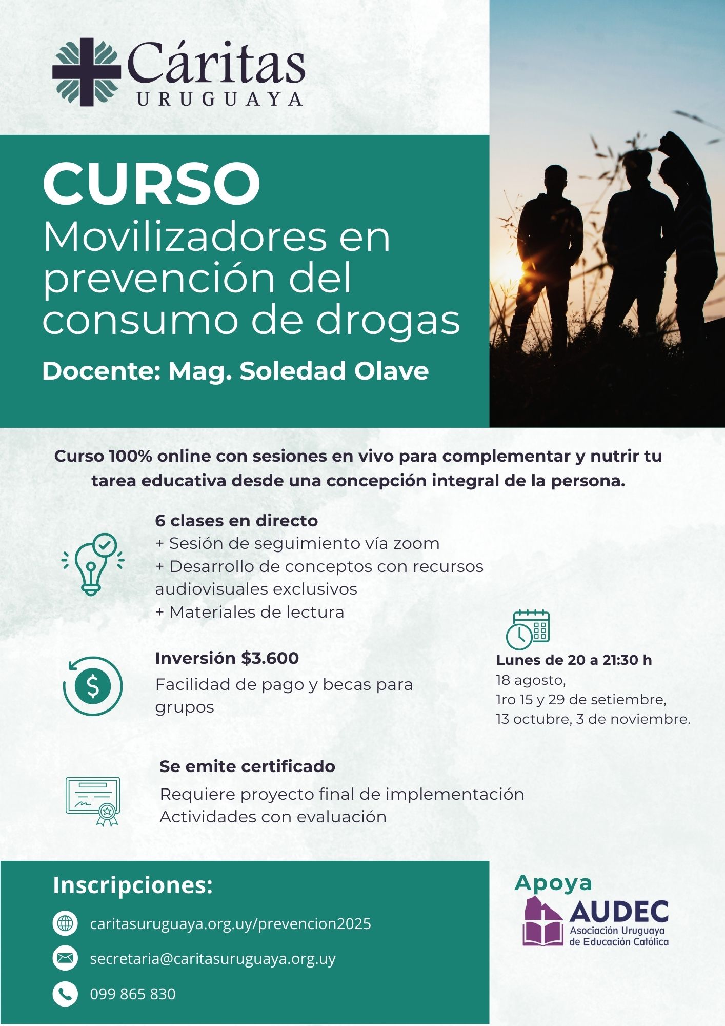 6 clases en directo + sesión de seguimiento vía zoom + desarrollo de conceptos con recursos audiovisuales exclusivos + materiales de lectura Lunes de 20 a 21:30 h Comienzo segunda edición: 18 agosto Clases: 18 de agosto, 1ro 15 y 29 de setiembre, 13 octubre, 3 de noviembre. Inversión: $3600.- Formulario de inscripción Programa completo Inicio sujeto a mínimo de 10 inscriptos Para realizar el pago: Transferencia bancaria – SANTANDER 4466691 SUC 62 – PESOS – CARITAS URUGUAYA Colectivo Redpagos – 35602 – CARITAS URUGUAYA (Por favor enviar comprobante una vez efectuado el pago por mail o WhatsApp) Contacto: secretaria@caritasuruguaya.org.uy – 099 865 830![]()